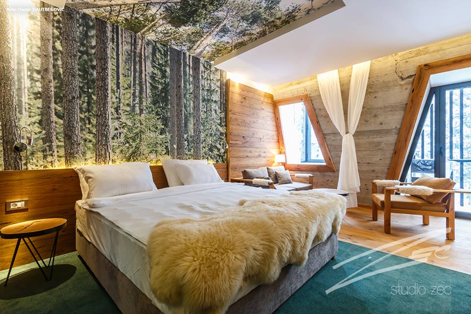 1. Lo Studio ZEC di Sarajevo ha scelto questo paesaggio boschivo per questa stanza d'albergo in Bosnia. La scelta di far rigirare l'immagine sul soffitto sopra il letto accentua le qualità scenografiche degli alberi, oltre a creare un bell'effetto per chi è sdraiato.